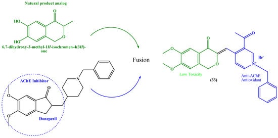 Xinnan Li et al., 2022 [52] designed and synthesized by fusing natural (±)-7,8-dihydroxy-3-methyl-isochroman-4-one pharmacophore with donepazil to achievea series of novel isochroman-4-one derivatives as given in Scheme 7, and their anticholinesterase potential against Alzheimer’s disease was evaluated. Compound 33 [(Z)-3-acetyl-1-benzyl-4-((6,7-dimethoxy-4-oxoisochroman-3-ylidene)methyl) pyridin-1-ium bromide] had average antioxidant activity and showed potent acetylcholinesterase (AChE) inhibitory activity as well. Molecular modeling and kinetic investigations demonstrated that compound 33 exhibited a dual binding inhibitory property and bound to both CAS and PAS of the enzyme AChE. In silico screening revealed that compound 33 could across the blood–brain barrier with high penetration. In addition, low cytotoxicity and moderate anti-Aβ aggregation efficacy were exhibited by the compound. Finally, the study revealed that compound 33 from a natural product exhibited a promising lead toward the development of a potent AChE inhibitory molecule in the treatment of AD.