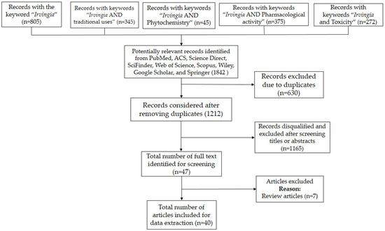 A total of 1842 (“Irvingia”: 805; “Irvingia and traditional uses”: 345; Irvingia and Phytochemistry”: 45; Irvingia and Pharmacological activity”: 193; “Irvingia and Pharmacology”: 182; “Irvingia and Toxicity”: 272) significant records were obtained, of which 630 were excluded for data duplicates. Among the 1212 records obtained after removing the duplicates, 1165 (Figure 1) were disqualified and omitted after screening the titles or abstracts. Thus, forty seven (47) full-length research articles were identified, of which seven were excepted as they were review articles. Finally, a total of forty (40) full text articles were included and exploited to collect relevant information. In addition, important facts obtained from unpublished materials were also included.