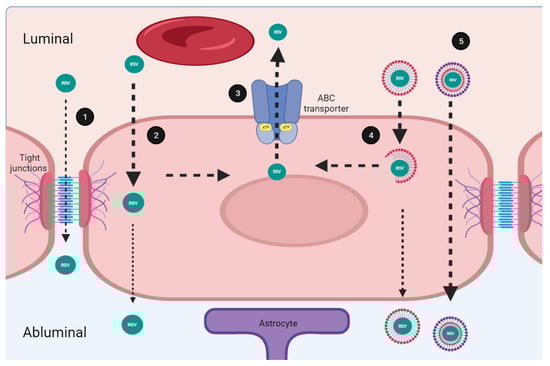 Transport mechanisms of resveratrol through the brain blood barrier. (1) Small molecules (≤1 nm) cross the blood–brain barrier (BBB) by passive transport, through the paracellular route. Resveratrol (RSV) partially crosses the BBB through this route. (2) Molecules with high lipid solubility might use the transcellular route which allows for the effective passive penetration of endothelial cells membrane. RSV is soluble in polar solvents, and highly permeable in membrane which facilitates its transportation through this route. (3) Micro endothelial cells express on their luminal side several multi drug resistance transporters (ABC, ATP-binding cassette transporters). The ABC transporters mediate the efflux of RSV decreasing its uptake rate. (4) Nano formulations consist of a polymeric system. The molecular composition impacts solubility and improves RSV passage through the BBB. (5) Some components of nanoformulations such as Polyethylene glycol 1000 and the vitamin E succinate inhibit the ABC transporters. Improved formulations overcome restrictions associated to the BBB facilitating RSV transport. Created with BioRender.com; accessed on 25 January 2023.