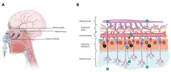 The transport of a drug from the nasal cavity to the brain can occur through both the olfactory and trigeminal nerves, through intracellular and extracellular routes. In the intracellular route, an olfactory neuron internalizes the molecule through the formation of an endocytic vesicle, which travels to the neuron’s projection site where it will be released by exocytosis in the olfactory bulb; this process will be replicated by the olfactory neurons carrying the drug to other brain regions []. In the extracellular route, the molecule first crosses the nasal epithelium and reaches the lamina propria. Second, the molecule passes through the tight junctions that connect the various cell types that make the lamina propria up before being transported externally; third, the molecule travels along the neuronal axon through the flow of cerebrospinal fluid, through the paracellular, and perineural spaces, to lastly reach the subarachnoid space of the brain []. Although some authors agree that afferent lymphatic vessels and blood vessels can also participate in the nose-to-brain transport of drugs, it is considered that the main route is through the olfactory nerve, since the neuroepithelium of the olfactory region is the only part of the CNS that is directly exposed to the environment [] (Figure 3).