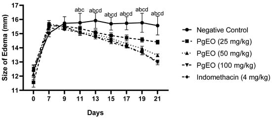 Effect of PgEO administration for 14 days on CFA-induced arthritic edema. Results are expressed as mean ± SEM of 6 animals per group (p < 0.001). a: Indomethacin vs. control group; b: 100 mg/kg vs. control group; c: 50 mg/kg vs. control group; and d: 25 mg/kg vs. control group.