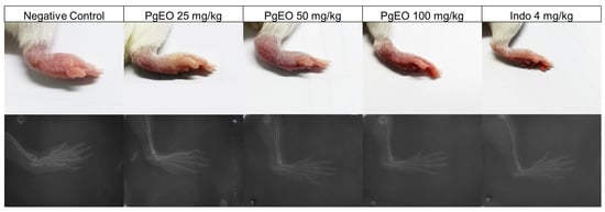 The evaluation of edema and radiographic imaging are methods used to assess the severity and progression of chronic joint diseases. These methodologies are considered the main approaches used in clinical practice for the diagnosis and prognosis of individuals affected by certain osteoarticular diseases [38]. Therefore, to correlate with clinical practice in the diagnosis of rheumatoid arthritis (RA), at the end of the treatment in the experimental model of CFA-induced arthritis, the paw edemas were photographed, followed by radiological examinations to assess whether the inducing agent caused osteoarticular alterations and whether treatment with PgEO reduced the damage in the animals (Figure 2).