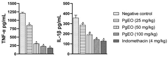 Effect of 14-day administration of PgEO on TNF-α and IL-1β levels in CFA-induced arthritis. The values represent mean ± SEM. * p < 0.001 compared to the control and one-way analysis of variance (ANOVA) followed by Dunnett’s test.