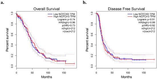 (a) The overall survival status for the expression of NOTCH3 from the GEPIA database and (b) the disease-free survival status for the expression of NOTCH3 from the GEPIA database. Dotted line: 95% confidence interval.