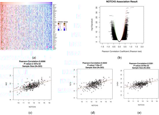 Coexpression analysis of NOTCH3 by LinkedOmics dataset in OC: (a,b) identification of coexpression profile of NOTCH3; (c) correlation analysis of NOTCH3 with WIZ expression; (d) correlation of NOTCH3 with TET1 expression; and (e) correlation of NOTCH3 with CHD4 expression Red line represents the line of regression.