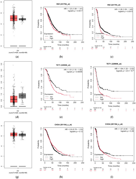 Expression and survival analysis of WIZ, TET1, and CHD4 in OC: (a) expression of WIZ using GEPIA database. Red box: Tumor tissues; Grey box: Normal tissue; (b) OS status for expression of WIZ using Kaplan–Meier Plotter; (c) PFS status of WIZ using Kaplan–Meier Plotter; (d) expression of TET1 using GEPIA database; (e) OS status of TET1 using Kaplan–Meier Plotter; (f) PFS of TET1 using Kaplan–Meier Plotter; (g) expression of CHD4 using GEPIA database; (h) OS status of CHD4 using Kaplan–Meier Plotter; and (i) PFS status of CHD4 using Kaplan–Meier Plotter.