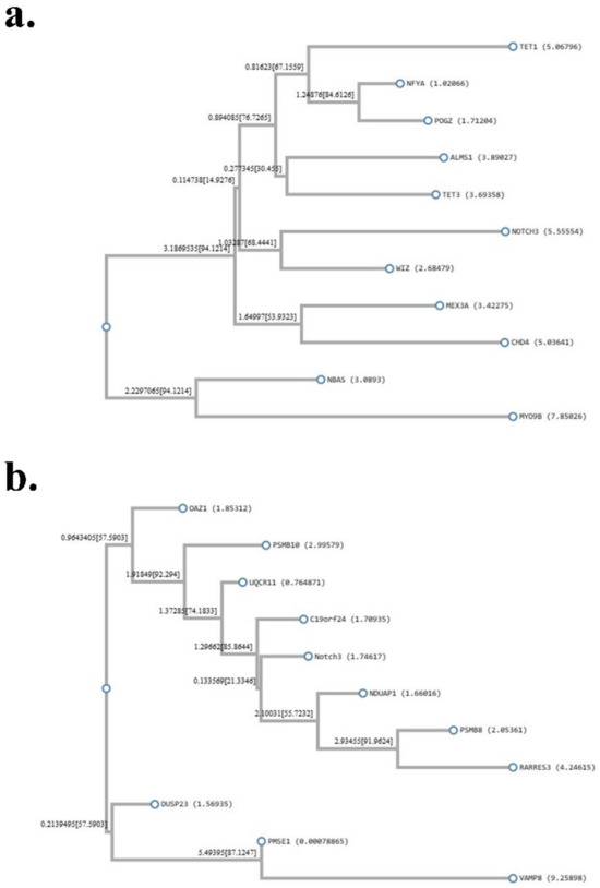 Additionally, an exploration was conducted to evaluate the impact of WIZ, TET1, and CHD4 on OS and PFS, as seen in Figure 7b,c,e,f,h,i. Moreover, utilizing the LinkedOmics databases, the analysis revealed a correlation between NOTCH3 and WIZ, TET1, and CHD4, as depicted in Figure 6. The Pearson correlation analysis indicated a positive relationship between the expression levels of WIZ, TET1, and CHD4. Further, the phylogenetic relationship between NOTCH3 and all of these correlated genes is depicted in Figure 8a,b.
