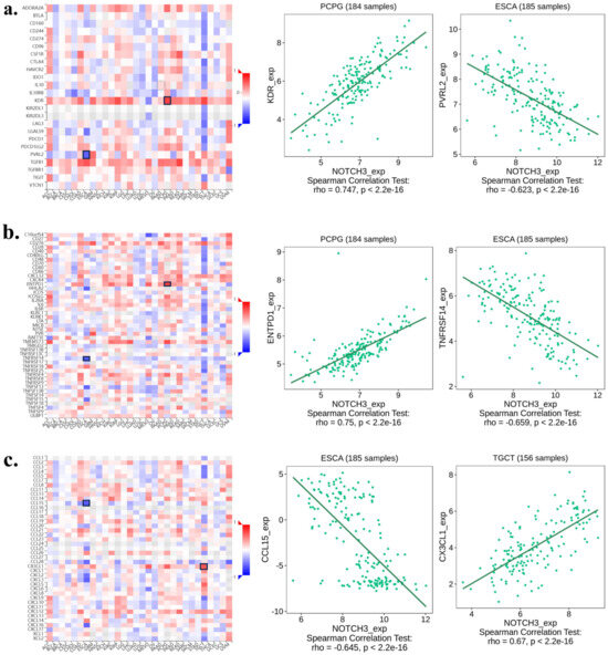 Spearman correlation analysis of NOTCH3: (a) with lymphocytes, i.e., TILs (y axis), across human cancers (x axis), (b) MHCs (y axis) across human cancers (x axis), (c) and receptors (y axis) across human cancers (x axis).