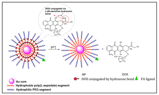 | pH-sensitive DOX release using Au-Poly(L-aspartate-DOX)-b-PEG-OH/FA NPs | 4T1 cells Mouse mammary carcinoma cells | EGFR, VEGFR2 | pH-triggered drug release system providing targeted delivery at acidic tumor environments, improving controlled drug release and therapeutic potential. | [65] | |