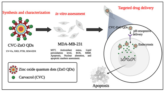 - Srinivasan, M.K.; Premnath, B.J.; Parimelazhagan, R.; Namasivayam, N. Synthesis, characterization, and evaluation of the anticancer properties of pH-responsive carvacrol-zinc oxide quantum dots on breast cancer cell line (MDA-MB-231). Cell Biochem. Funct. 2024, 42, e4062. [Google Scholar] [CrossRef]