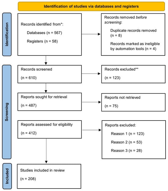 PRISMA 2020 flow diagram for this systematic review. * Consider, if feasible to do so, reporting the number of records identified from each database or register searched (rather than the total number across all databases/registers). ** If automation tools were used, indicate how many records were excluded by a human and how many were excluded by automation tools.