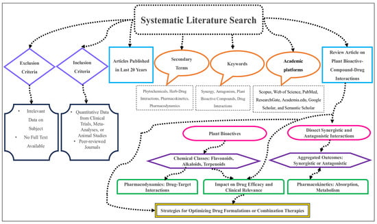 For this, we performed a systematic literature search based on various scientific databases, namely Scopus, Web of Science, PubMed, ResearchGate, Academia.edu, Google Scholar, and Semantic Scholar, from 11 August 2024 to 30 December 2024, to identify relevant studies. The search will be based on relevant keywords such as synergy, antagonism, plant bioactive compounds, and drug interactions) supplemented with secondary terms such as phytochemicals, herb–drug interactions, pharmacokinetics, and pharmacodynamics (Figure 1). Articles published in the last 25 years will be prioritized to ensure the review reflects current findings and developments in the field (Appendix A).