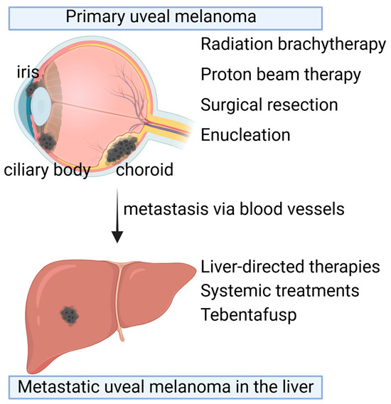 Therapeutic options for primary uveal melanoma and metastatic uveal melanoma. Primary uveal melanoma (UM) occurs in the choroid, ciliary body, and iris in the eyes. Depending on the size and location, primary UM can be treated with radiation brachytherapy, proton beam therapy, surgical resection, or enucleation. Despite the primary tumor treatments, 50% of patients develop metastasis in the liver a long time after primary tumor treatments. Liver-directed therapies or systemic treatments such as Tebentafusp are the available therapeutic options. Created with BioRender.com.