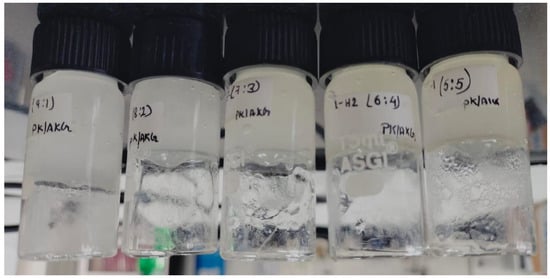 The organoleptic responses of CS/PVA hydrogels disclose the significant distinctions in the tactile and tangible characteristics of formulations with varying PVA:CS ratios. Hydrogels with a higher PVA content (9:1 and 8:2) had a firmer texture and a slightly more transparent appearance than those with a higher chitosan content (7:3, 6:4 and 5:5), which were softer and more opaque, as shown in Table 1 and Figure 1. The increased chitosan ratio resulted in a more slippery and moisturised hydrogel, which improves the mucoadhesive characteristics. Hydrogels with more chitosan have a slightly higher gel consistency, most likely due to variations in polymer interactions. Furthermore, formulations with a higher chitosan content exhibited a somewhat less uniform appearance, with occasional microscopic abnormalities detected. Despite these differences, all formulations were odourless and free of apparent phase separation, indicating their suitability for intrauterine use.