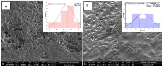 The PVA/CS (7:3) hydrogel was selected for further analysis by considering the aforementioned parameters. H3 showed moderate polymeric behaviour and regulated the swelling ratio, emerging as the best formulation, combining significant absorption with mechanical integrity for successful intrauterine drug delivery. The ofloxacin-loaded hydrogel and the blank hydrogel’s surface topology were examined using SEM, as shown in Figure 2, which offers essential information about their possible functional and structural variations. Since its microstructural characteristics, such as porosity, surface roughness and pore size, directly impact hydrogels’ water absorption, swelling behaviour and drug loading capability, SEM is essential for describing them. The SEM investigation of blank hydrogel (39.02 µm) revealed a highly porous and uneven structure, suggesting the possibility of high water retention and drug encapsulation. On the other hand, OFX-H3 (44.31 µm) had a smoother and more compact shape, with slightly increased pore size and prominent depressions, indicating that the drug had been well integrated into the polymeric matrix.
