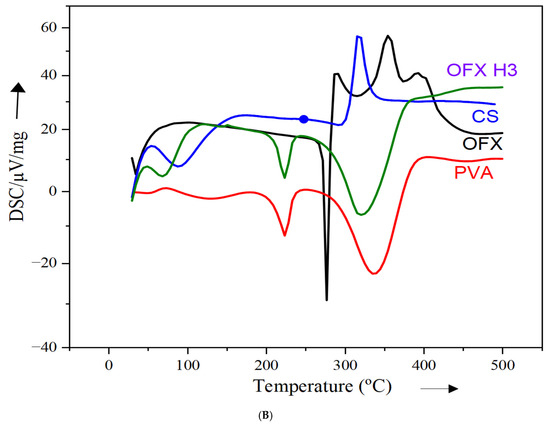 The DSC thermogram provides insights into the thermal properties of individual components (PVA, ofloxacin and chitosan) and the ofloxacin-loaded composite (OFX H3). In Figure 3B, the red curve, representing PVA, exhibits an endothermic peak at approximately 220 °C, corresponding to its melting or dehydration process, which reflects its crystalline nature [27]. The green curve for pure ofloxacin shows a sharp melting peak at around 275 °C, confirming its crystalline structure [26]. The blue curve for chitosan reveals a broad endothermic peak at approximately 100–150 °C, indicative of its amorphous nature and associated with water loss or relaxation transitions in the polymer [27]. In contrast, the black curve for the OFX H3 composite shows significant thermal changes. The sharp melting peak of ofloxacin observed at 275 °C is no longer visible, suggesting a reduction in crystallinity due to the incorporation of the drug into the polymeric matrix. The broad thermal transitions observed indicate strong interactions within the composite between PVA, chitosan and ofloxacin. These changes confirm the successful molecular dispersion or encapsulation of ofloxacin, ensuring compatibility of the components. The observed thermal shifts and reduced crystallinity highlight the potential of this composite formulation to improve drug release and bioavailability in drug delivery applications.