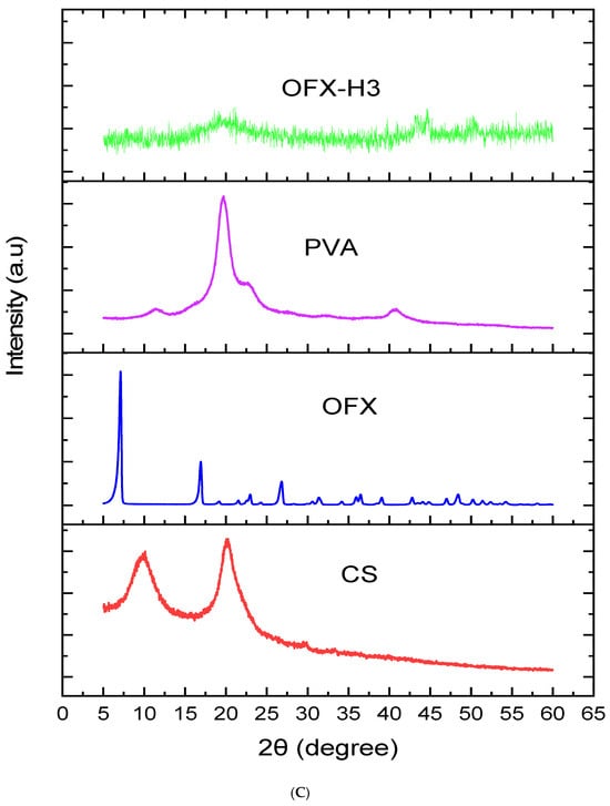 The FTIR analysis provides detailed insight into the OFX, PVA, CS and their composite hydrogel (OFX-CS/PVA Hydrogel) structural features in Figure 3A. The spectrum of OFX displayed characteristic peaks at approximately 1720 cm−1 corresponding to C=O stretching of the carbonyl group, 1620 cm−1 attributed to C=C stretching in the aromatic ring and a broad band around 3300–3500 cm−1 due to N-H stretching of the secondary amine group. These peaks confirm the molecular structure of the drug [26]. For PVA, the spectrum exhibited a broad O-H stretching band around 3200–3500 cm−1, indicative of hydroxyl groups, alongside C-H stretching at ~2900 cm−1 and C-O stretching at ~1090 cm−1, which are consistent with the polymer backbone of poly (vinyl alcohol). Similarly, the CS spectrum showed prominent peaks at ~3400 cm−1 for O-H and N-H stretching, 1650 cm−1 (Amide I) for C=O stretching, 1590 cm−1 (Amide II) for N-H bending and ~1070 cm−1 for C-O stretching, all of which align with the polysaccharide structure of chitosan [27]. The OFX-CS/PVA Hydrogel spectrum demonstrated notable shifts and intensity changes, indicating interactions among the components. The broad O-H and N-H stretching band (~3300–3500 cm−1) in the hydrogel was slightly shifted and exhibited reduced intensity, suggesting hydrogen bonding between PVA, CS and OFX. The C=O stretching peak at ~1720 cm−1 from OFX showed diminished intensity, further supporting the formation of interactions between OFX and the hydrogel matrix. Additionally, the C-O stretching peaks (~1090–1070 cm−1) were retained but displayed minor shifts, reflecting the integration of OFX into the CS/PVA network. These spectral features confirm the hydrogel’s successful formation and the OFX encapsulation, with evidence of molecular interactions enhancing the structural integrity of the composite material.