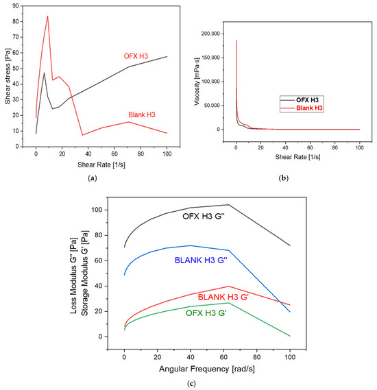 The rheological properties of the samples, OFX H3 and Blank H3, were analysed to understand their mechanical behaviour under the shear and dynamic conditions mentioned in Figure 4. The shear stress versus the shear rate plot shows that OFX H3 exhibits a steady increase in shear stress with an increasing shear rate, indicating stable and predictable behaviour. In contrast, blank H3 displays an initial peak followed by a decline and levelling-off at higher shear rates, which suggests shear-thinning and irregular stress behaviour. Similarly, the viscosity versus shear rate graph reveals that both samples exhibit shear-thinning properties, as the viscosity decreases significantly with an increasing shear rate. However, OFX H3 maintains slightly higher viscosity at comparable shear rates, suggesting more excellent stability under shear. The dynamic moduli analysis highlights key differences in the elastic and viscous components of the two samples. For OFX H3, the loss modulus (G”) dominates over the storage modulus (G’) across the frequency range, indicating a predominantly viscous nature. While both G’ and G” increase with frequency, the viscous component remains the primary contributor. Conversely, blank H3 exhibits relatively higher elastic contributions, as indicated by its higher G’ values compared to OFX H3, suggesting enhanced structural integrity under dynamic conditions. Both samples show frequency-dependent strengthening, with G’ and G” increasing with angular frequency. Thus, OFX H3 demonstrates stable shear-stress growth and more excellent viscosity stability under shear, making it ideal for applications requiring predictable flow properties. Blank H3, with its higher elastic contributions, could be more suitable for applications that require improved structural integrity under deformation [31].