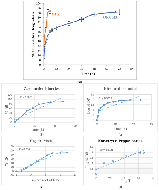 (a) In vitro drug release of ofloxacin solution and OFX-H3, graph of various release kinetic models of OFX-H3; (b) zero order kinetics; (c) first order model; (d) Higuchi model; (e) Korsmeyer-Peppas profile.