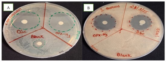 In vitro antimicrobial study of blank and ofloxacin-loaded hydrogel in (A) E. coli and (B) S. aureus.