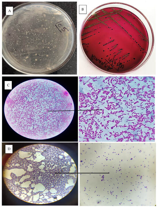 The identification and isolation of bacteria from the cervicovaginal mucus (CVM) of a cow with metritis involve collecting a sterile swab sample from the vaginal canal or cervix and processing it in the laboratory. The sample is inoculated onto selective and nonselective media, such as MLA, BHI and SDA, and incubated under appropriate conditions [36]. Figure 7B represents the growth of E. coli in EMB agar media. A critical step in identification is gram staining, which differentiates bacteria based on their cell wall structure. Gram-positive bacteria, such as Staphylococcus spp., retain the crystal violet stain and appear purple under the microscope (Figure 7D), while gram-negative bacteria, such as Escherichia coli, do not retain the crystal violet but take up the counterstain (safranin) and appear pink (Figure 7C). The most commonly isolated bacterium was E. coli, followed by Staphylococcus spp., mixed infection (gram-positive rods and gram-negative rods) and Candida spp. Brucella spp. was not detected in any CVM samples.