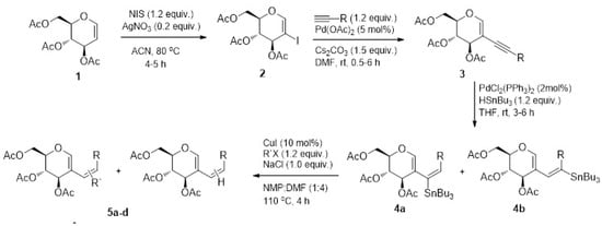 - Shamim, A.; Barbeiro, C.S.; Ali, B.; Stefani, H.A. Synthesis of Stannyl-Substituted D-Glucal Derivatives via Palladium-Catalyzed Regioselective Hydrostannation and Their Synthetic Applications. ChemistrySelect 2016, 1, 5653–5659. [Google Scholar] [CrossRef]