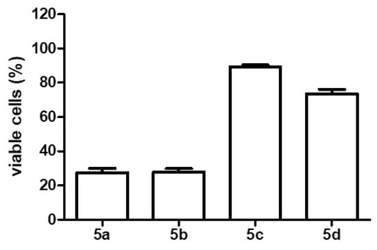 The four analogues were tested in Mia-Paca-2 pancreatic cancer cells, which were analyzed to verify their viability. Compounds 5a and 5b caused significant cell death (about 80%) when incubated in cells for 48 h, according to the MTT assay, with 2 µM. Compounds 5c and 5d had little effects on cell viability within the same incubation time (Figure 3).