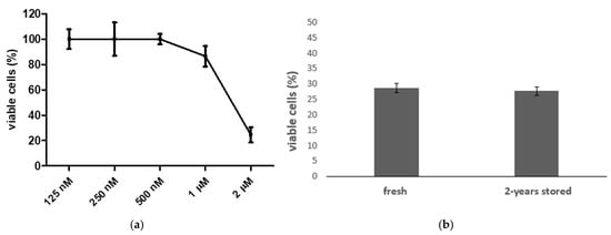 Considering the highly selective, potent effects on Mia-Paca-2, we elected compound 5b as the best option for further studies. Thus, the IC50 value was estimated at 1.39 ± 0.006 µM in this cell line, as shown in Figure 4a. This compound was stable in an aqueous solution. A cell viability MTT assay was used to verify the activity of 5b stored in 2–8 °C for 24 months in 0.9% sterile saline solution, in comparison to a sample that was synthesized, diluted and immediately used. No significant differences were noticed in the cell viability of Mia-Paca-2: 27.8% of cells were viable after 2 years of storage compared to the 28.78% viability of the fresh cells (Figure 4b).