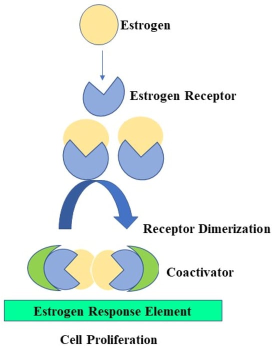 CYP1A1 hydroxylates E2 at the C2 position, while CYP1B1 metabolizes estradiol to 4-OH estradiol and is further converted by CYP peroxidases to estradiol-3,4-quinone. Studies have shown that 4-OH estrogen is more carcinogenic than 2-OH estrogen. Higher catalytic COMT activity towards 2-OH might be responsible for this [62]. The metabolites formed bind covalently to adenine or guanine on DNA. 4-OH-estradiol-1-N7-guanine and 4-OH-estradiol-1-N3-adenine are the adducts formed. These adducts are released, creating basic sites on DNA, making them more prone to the mutation process by interrupting the DNA repair process. These mutations can induce certain types of cancer, including breast cancer. In breast cancer cases, higher amounts of quinone metabolites are found as compared to normal controls, indicating that these quinones play a major role in the process of carcinogenesis [63]. The reactive quinones and semiquinones are formed via the redox recycling of catechol estrogen, especially 4-OH estradiol. Semiquinones are oxidized to quinones by molecular oxygen. The cycle is completed by the reduction of semiquinone to quinone by CYP reductase. This process is accompanied by the reduction of molecular oxygen to superoxide anion and its further conversion to hydrogen peroxide. Both superoxide anions and semiquinones are mutagenic. NADPH quinone oxidoreductase reduces quinone to hydroquinone by the transfer of two electrons and without the formation of reactive semiquinone production. Fe3+ and Cu2+ ions are reduced to Fe2+ and Cu+ ions by catechol estrogen. These transition metals catalyze the Fenton reaction, resulting in the formation of hydroxyl radical from hydrogen peroxide and superoxide anion [64]. The hydroxyl radical takes part in the addition and transfer of electrons as well as in the abstraction of hydrogen. It initiates lipid peroxidation by abstracting hydrogen from lipids in membranes. However, its reaction with DNA bases proceeds with the process of addition, like its addition with guanine ends up with the formation of 8-hydroxyguanine radical, leading to DNA damage [65,66,67]. The mechanism of action of the estrogen receptor pathway is shown in Figure 1.