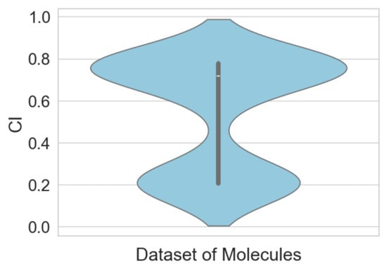 The values of for all the elements of D are calculated using the RDKit tool, which is based on the method developed by [9]. Figure 1 shows the violin plot for the 123 molecules in D. It can be seen that the synthetic accessibility of most of the molecules is concentrated between and . However, determining the threshold of that offers good synthesizability of the molecules is not really assessable with this information. In Figure 2, we show the violin plot for the 123 molecules in D. The values of the CIs for all the elements of D are calculated using the IBM RXN for Chemistry AI tool [13]. The results in the graph show that a considerable number of molecules can be synthesized with over confidence. However, we do not clearly specify the threshold CI value that indicates a ‘good’ value for a synthesizable molecule.