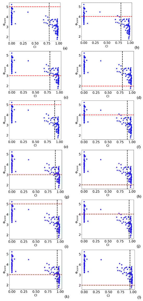 The variation in the predictive synthesis feasibility of the molecules in D for (a) Th1 = 5 and Th2 = 0.75, (b) Th1 = 4 and Th2 = 0.75, (c) Th1 = 3 and Th2 = 0.75, (d) Th1 = 2 and Th2 = 0.75, (e) Th1 = 5 and Th2 = 0.9, (f) Th1 = 4 and Th2 = 0.9, (g) Th1 = 3 and Th2 = 0.9, (h) Th1 = 2 and Th2 = 0.9, (i) Th1 = 5 and Th2 = 0.95, (j) Th1 = 4 and Th2 = 0.95, (k) Th1 = 3 and Th2 = 0.95, and (l) Th1 = 2 and Th2 = 0.95.