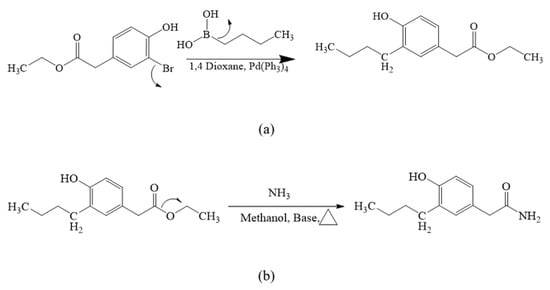 The principal synthesis precursors to realizing the target molecule are shown in Table 2. The precursor, 1,4–Dioxane, is a cyclic ether used as a solvent, and Palladium is used as a catalyst in cross-coupling reactions. Potassium carbonate is a base, Butyl boronic acid is a reactant used in a compound used in Suzuki coupling, and Ethyl 2-(3-bromo-4-hydroxyphenyl)acetate is an ester containing bromo and hydroxy substituents on a phenyl ring. The reaction occurs in two steps, as shown in Figure 4. The first step entails debromination of the starting material, (ethyl 2-(3-bromo-4-hydroxyphenyl) acetate), and the debromination reaction is catalyzed by (Palladium (tetrakis triphenylphosphine), Pd(PPh3)4). The base (K2CO3) facilitates the conversion of N butyl boronic acid into a more reactive species, and the two starting materials react at elevated temperatures (50–80 °C) to enhance the reaction rate. This type of reaction is referred to as the Suzuki–Miyaura reaction [14] since they form a new carbon to carbon (C-C) bond between the phenyl group of the alkyl group and the alkyl group of the boronic acid. The second step entails ammonolysis (addition of ammonia (NH3) to form amines or nitrides) of the first step product (ethyl 2-(3-butyl-4-hydroxyphenyl)acetate), and the reaction is carried out in methanol (CH3-OH) as a solvent, and it is also carried out in elevated temperatures to increase the speed of the reaction.