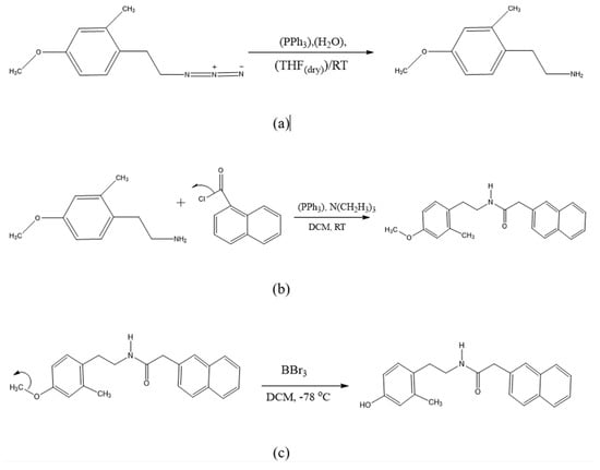 The principal synthesis precursors to realizing the target molecule are shown in Table 3. The precursors, THF and Dichloromethane, are polar and non-flammable chlorinated solvents, respectively. Triethylamine and Triphenylphosphine are organic compounds and nucleophilic catalysts, respectively. The compound, 1-(2-azidoethyl)-4-methoxy-2-methylbenzene, is an azide-functionalized aromatic compound. The reaction to synthesizing O=C(NCCc1ccc(O)cc1C)Cc2cccc3ccccc32 occurs in three steps, as shown in Figure 5. The first step entails hydrating 1-(aminoethyl)-4-methoxybenzene to convert it to an amide species in the presence of triphenylphosphine (PPh3) as a catalyst. These types of reactions are called Staudinger reactions [15], which are reactions of organic azides with phosphines to produce iminophosphorane. The second step involves deprotonation of the amide group in 2-(4-methoxy-2-methylphenyl)ethan-1-amine, and the deprotonation is enhanced by using triethylamine as a base. The reactant (1-naphthoyl chloride) is also dechlorinated, resulting in the reaction between the two starting materials to form N-(4-methoxy-2-methylphenethyl)-2-(naphthalen-2-yl) acetamide and hydrogen chloride (HCl). The last step entails the formation of an alcohol N-(4-hydroxy-2-methylphenethyl)-2-(naphthalen-2-yl) acetamide, and the reaction is carried out at −78 °C to avoid side reactions that may occur because of utilizing boron tribromide (BBr3).
