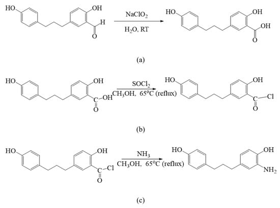 The principal synthesis precursors to realizing the target molecule are shown in Table 4. The precursor, 2-Hydroxy-5-(3-(4-hydroxyphenyl)propyl)benzaldehyde is a phenolic aldehyde with antioxidant and potential bioactive properties. Ammonia and sulfuric acid are reactants in the synthesis route, while sodium chlorite acts as a strong oxidizing agent. The compounds methanol and ethanol are solvents in the reactions. The reaction to synthesizing Oc1ccc(CCCc2ccc(O)cc2)cc1C(=O)N occurs in three steps, as shown in Figure 6. Reaction step 1 is the reaction between 2-hydroxy-5-(3-(4-hydroxyphenyl)propyl)benzaldehyde and sodium chlorite (), which typically results in the oxidation of the aldehyde group (-CHO) to a carboxylic acid group (-COOH). Reaction step 2 is the reaction between 2-hydroxy-5-(3-(4-hydroxyphenyl)propyl)benzoic acid, sulfuric acid, and methanol, which is a classic esterification reaction. This process is often referred to as Fischer esterification [16], in which the carboxylic acid group (-COOH) reacts with methanol in a strong acid catalyst (sulfuric acid) to form the acid’s methyl ester. Reaction step 3 entails the nucleophilic substitution of the ethoxy group of the ketone group with an amine group, resulting in the formation of the amine species and, consequently, the targeted molecules. However, for the AI-predicted synthesis pathways presented above, substituting an ethoxy group with an amine is not straightforward because the ethoxy group is a poor group that leaves under normal conditions [17]. Therefore, an alternative reaction pathway is presented in Figure 7.