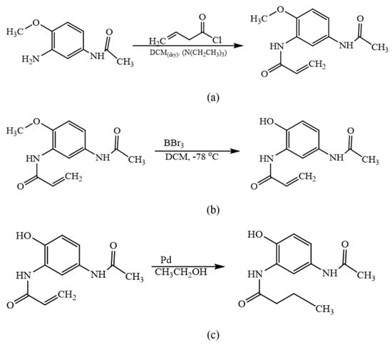 The principal synthesis precursors to realizing the target molecule are shown in Table 5. The precursors N-(3-amino-4-methoxyphenyl)acetamide and Vinylacetate chloride are used as reactants in the synthesis process, while Dichloromethane and Triethylamine are a solvent and a base or catalyst, respectively. Reaction step 1 shown in Figure 8a involves the acylation on the aromatic ring of the acetamide derivative and is expected to proceed via the nucleophilic acyl substitution, where the lone pair (–NH2) in the amide attacks the electrophilic carbonyl carbon of vinyl acetate chloride, resulting in the chloride ion (Cl−) acting as the leaving group, resulting in the formation of the amide bond between the amine and the vinyl acetate chloride. Reaction step 2 shown in Figure 8b typically involves the demethylation of the methoxy group (–OCH3) on the aromatic ring, yielding a hydroxyl group (–OH). Boron tribromide is a strong Lewis acid commonly used to cleave methyl ethers in organic compounds [18]. It is carried out at low temperatures (e.g., −78 °C to 0 °C) to minimize side reactions and ensure selective demethylation. Reaction step 3 shown in Figure 8c entails the conversion of the acrylamide double bond to form the corresponding butyramide via hydrogenation of acrylamide derivative in the presence of a hydrogenating catalyst (Pd catalyst) and methanol acting as a hydrogen source.