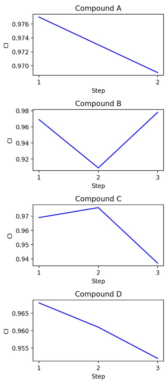 In Figure 9, the CI of synthesis vs. steps graph for the retrosynthesis of each of the compounds is presented to visualize the progression of the retrosynthetic analysis of the overall steps to the target, Oc1ccc(cc1CCCC)CC(=O)N. It can be observed that there are only two steps to compound A with an overall CI of 0.946, which makes it stand out as the most synthesizable due to its high overall confidence and fewer synthesis steps. The overall CIs for compounds C and D are close at 0.887 and 0.885, respectively. It can be seen that the overall CI for compound B is the lowest at 0.861, which makes it the least synthesizable of the four compounds. From Figure 9, it can be seen that step 2 is the significant bottleneck step that affects the synthesizability of compound B. To improve the synthesizability of compound B, alternative reaction types achieve the same transformation, but with easier reactions.