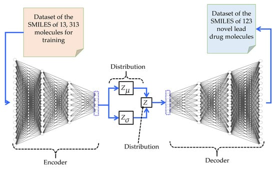 The dataset contains 123 new beta-blocker-like lead drug molecules generated using a generative model. The dataset and the AI-based method for generating the molecules are presented in [12]. Figure 11 shows the AI-based framework that was used to generate the molecules in D. In the framework, a set of 13,313 molecules was used to train a variational autoencoder (VAE)-based generative model. The VAE structure consists of an encoder, a decoder, and a latent space defined by the mean, , and standard deviation, , of a Gaussian distribution. The output of this process is a set of 123 unique molecules generated by the VAE-based generative model, which forms the dataset, D, used in the rest of this paper.