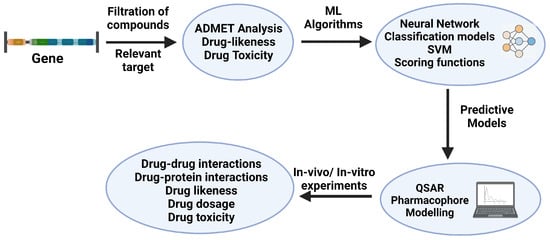 Drug optimization workflow (adapted from [3,194,195,196]). The filtration of compounds of a target is performed through various ML algorithms and scoring functions for the drug likeness, toxicity, and ADMET (absorption, distribution, metabolism, excretion, and toxicity) predicting tools. Created with BioRender.com.