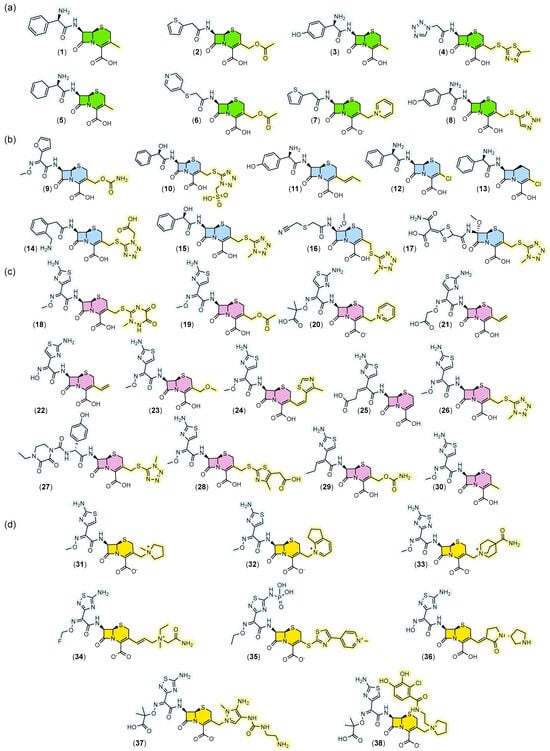 Structures of cephalosporins grouped by generation. In (a) first generation, (b) second generation, (c) third generation, (d) fourth and fifth generation. In each generation the scaffold is represented in different colors. The substituent group at position 7 is highlighted in blue and the substituent group at position 3 is highlighted in yellow. Cephalexin (1), Cefazolin (2), Cefadroxil (3), Cephalothin (4), Cephradine (5), Cephaloridine (6), Cefapirin (7), Cefatrizine (8), Cefuroxime (9), Cefonicid (10), Cefprozil (11), Cefaclor (12), Loracarbef (13), Ceforanide (14), Cefamandole (15), Cefmetazole (16), Cefotetan (17), Ceftriaxone (18), Cefotaxime (19), Ceftazidime (20), Cefixime (21), Cefdinir (22), Cefpodoxime (23), Cefditoren (24), Ceftibuten (25), Cefmenoxime (26), Cefoperazone (27), Cefodizime (28), Cefcapene (29), Cefetamet (30), Cefepime (31), Cefpirome (32), Cefclidine (33), Cefluprenam (34), Ceftaroline (35), Ceftobiprole (36), Ceftolozane (37), Cefiderocol (38). All colors are used consistently with the previous figures: green for the first generation, blue for the second, purple for the third and yellow for the fourth and fifth.