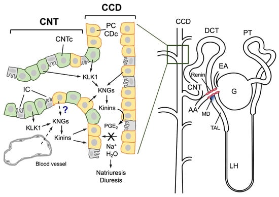 Schematic representation of the human nephron (right) and the major characteristics of the junction between the connecting tubule and the cortical collecting duct (left). A human nephron is represented, and its different segments are identified: G, glomerulus; EA, efferent arteriole; PT, proximal tubule; DCT, distal convoluted tubule; LH, loop of Henle; TAL, thick ascending limb of Henle; CNT, connecting tubule; CCD, cortical collecting duct. An anatomical relationship is established between the afferent arteriole (AA), the connecting tubule, and the macula densa (MD), labeled in blue at the end of the TAL; renin is synthesized in the muscular cells of the afferent arteriole (pink cells). In the distal nephron, cells of both CNT (CNTc, pale green cells) and CCD (orange cells known as collecting duct cells, CDc, or principal cells, PC) intermingle over a certain distance. CNTc produce and secrete renal kallikrein (KLK1) into the tubular lumen and the tubulointerstitium, and CDc/PC produce kininogens (KNGs), making kinin production feasible in both the urinary fluid and the interstitium. Both the CNT and CCD also have intercalated cells (gray cells), which are not involved in kallikrein or kininogen synthesis. It is still unknown whether kininogens are secreted by CDc/PC or are filtered from interstitial capillaries into the interstitium. Once formed, kinins may stimulate the release of prostaglandin E2 (PGE2) from CDc/PC that in turn inhibits sodium and water reabsorption, resulting in diuresis and natriuresis.