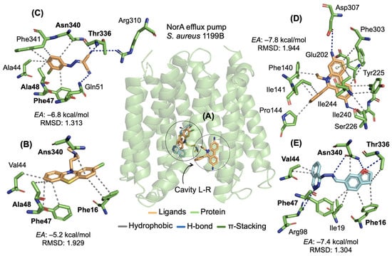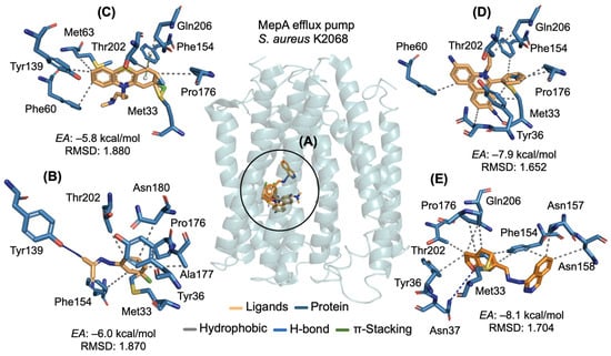 Three-dimensional visualization of ligand docking in the MepA efflux pump, strain S. aureus K2068 (A), and three-dimensional visualization of ligand–receptor interactions between amino acid residues (blue color) of the MepA efflux pump for the ligands (nude color) (B) CCCP, (C) CPZ, (D) EtBr and (E) hydrazone (orange).