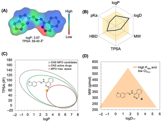 (A) Surface map of molecular lipophilicity potential (MLP) of the base conjugated to hydrazone (logD7.4), (B) multiparameter optimization (MPO) radar which expresses the degree of ADME desirability. The MPO spectrum was specifically analyzed by aligning (C) TPSA and logP to estimate the permeability profile in the CNS. (D) MW and logD at pH 7.4 to estimate the oral absorption profile and metabolic stability and by aligning.