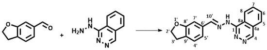 In a 25 mL round-bottom flask, 0.50 mmol of 2,3-dihydrobenzofuran-6-carbaldehyde was mixed with 0.50 mmol of the drug hydralazine, 9.0 mL of distilled water, and 1.0 mL of concentrated H3PO4 (Scheme 1). The reaction mixture was stirred magnetically and heated at 100 °C for 45 min. Then, 15 mL of absolute ethanol was added to the reaction mixture, which was subsequently filtered, and the filtrate was collected in a beaker. The residue retained on the filter paper was discarded, and 20 mL of a cold 5.0% (w/v) aqueous NaHCO3 solution was added to the filtrate. The resulting solid was vacuum filtered, washed with cold absolute ethanol, and dried at room temperature. Finally, the solid was removed from the filter paper and weighed.