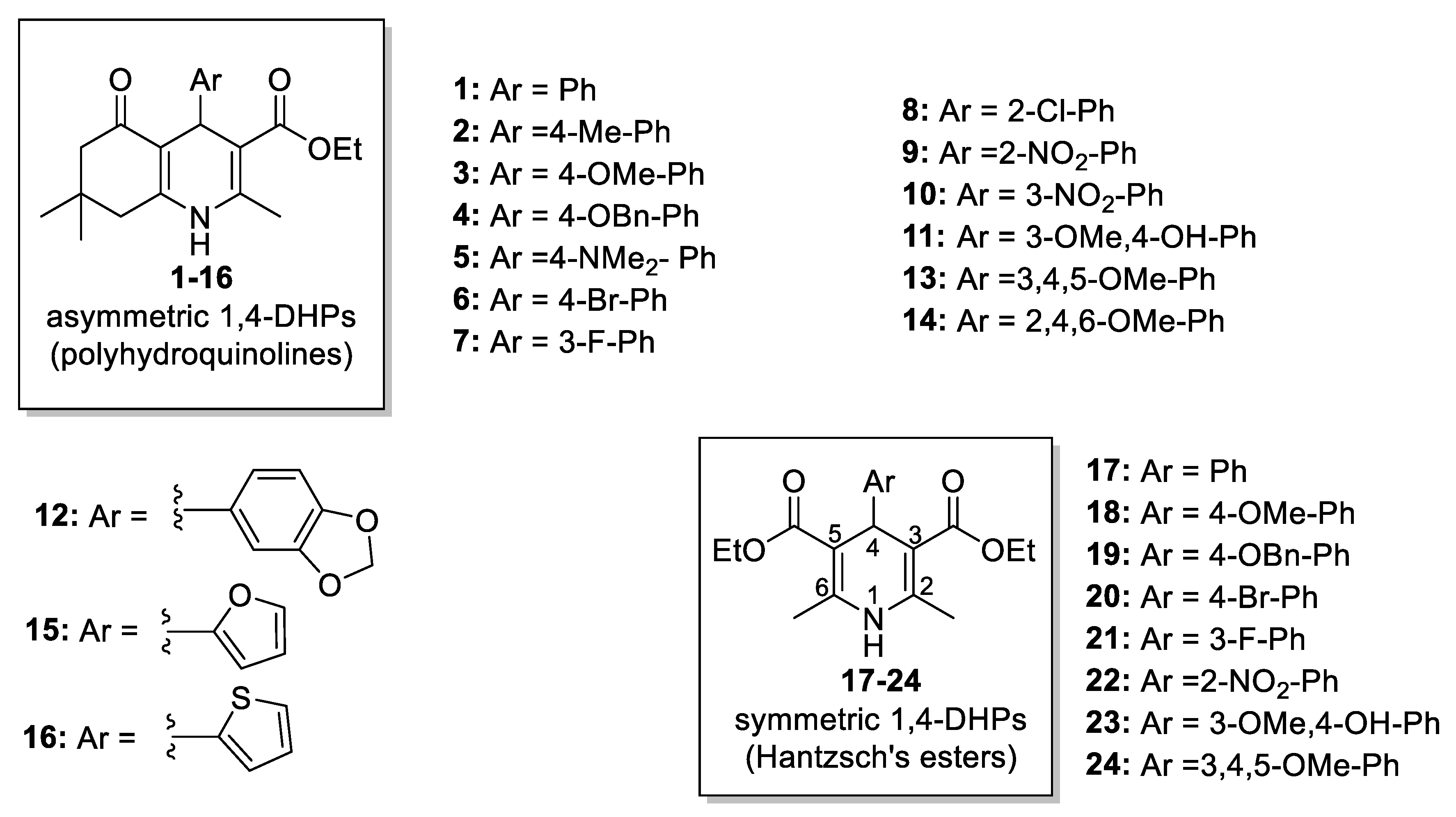 The 1,4-DHPs 124 were synthesized as previously reported [10,14,18] and identified based on their NMR (1H, 13C, and DEPT 135) and mass spectra. Their minimal purity of 95% was checked using HPLC (see all the spectra and the experimental details in the Supporting Information). Compounds 116 were isolated and tested as mixtures of enantiomers.