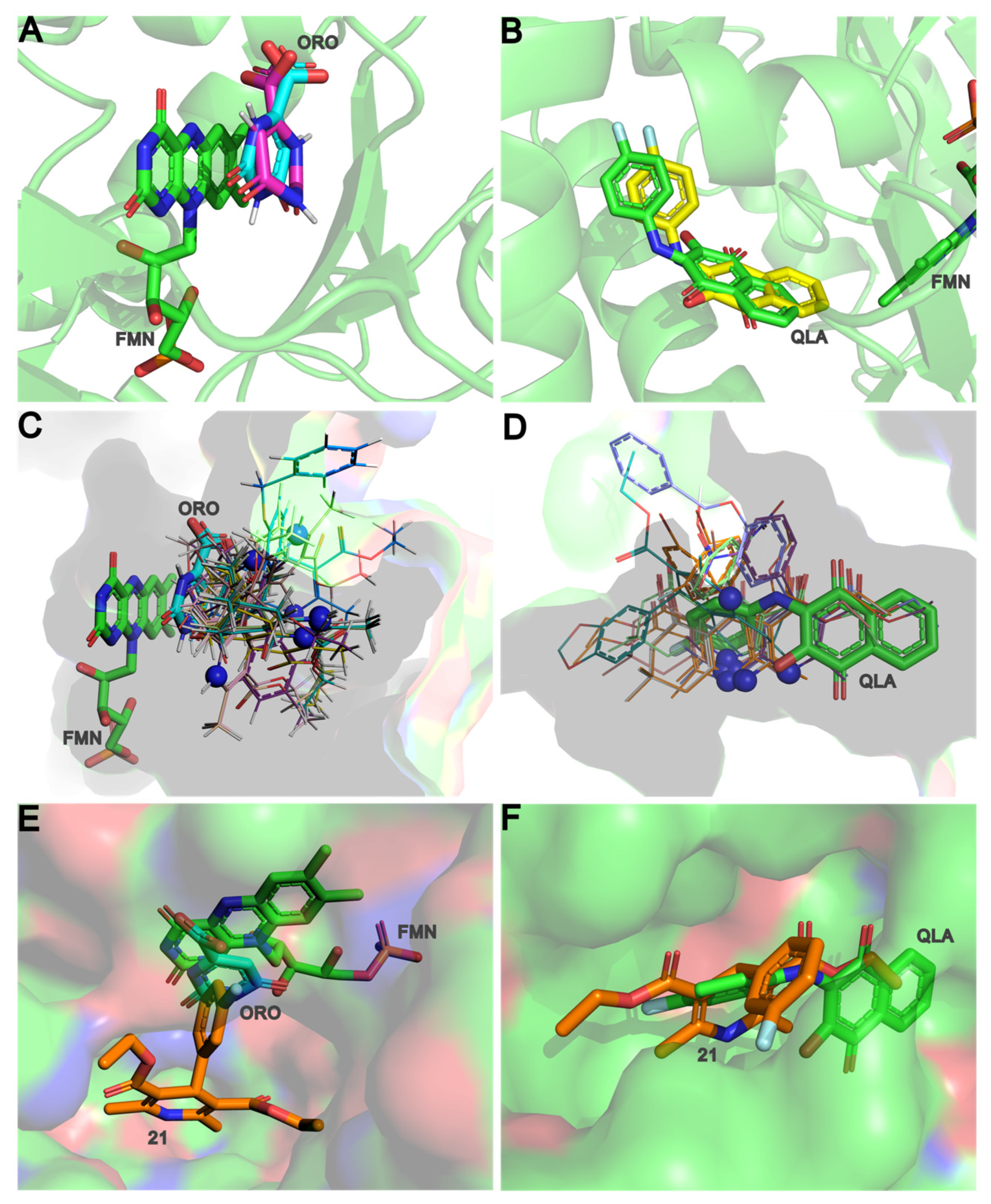 Figure 4. Best conformations for 1,4-DHPs in molecular docking simulations performed on ORO active site (left) and QLA active site (right). Orotate best conformation ((A)—pink) in comparison to reference ((A)—cyan) retrieved from redocking simulation; as well as QLA best conformation ((B)—yellow) in comparison to reference ((B)—green). Distribution of 1,4-DHPs best conformation (lines) for ORO active site (C) and QLA active site (D) with highlight to N1 atom of 1,4-DHP ring as blue spheres. Best conformation for the most active compound 21 in comparison to ORO (E) and QLA (F).