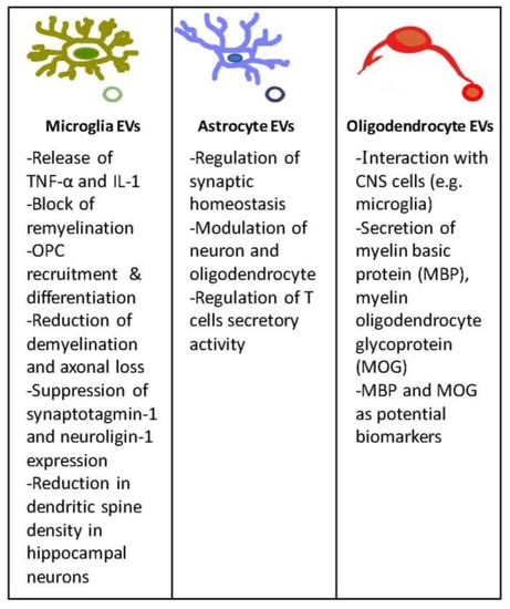 Oligodendrocytes, highly specialized cells responsible for myelin production and targets of inflammatory and immune attacks typical of MS, are somewhat interesting []. A growing body of evidence suggests oligodendrocyte lineage might have a more central role in the origin and progression of MS [], thanks to the ability of these cells to express immunomodulatory factors []. Like the other glial cell types, oligodendrocytes secrete EVs which are able to interact with other CNS cells [,]. Studies about oligodendrocyte-derived EVs are still few and mainly focused on their potential use as biomarkers; Agliardi and colleagues, which focused on myelin basic protein (MBP) and myelin oligodendrocyte glycoprotein (MOG) content in oligodendrocytes-derived EVs from the serum, suggested their use as biomarkers to help in the diagnosis of clinical MS phenotypes [].