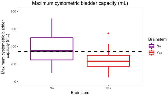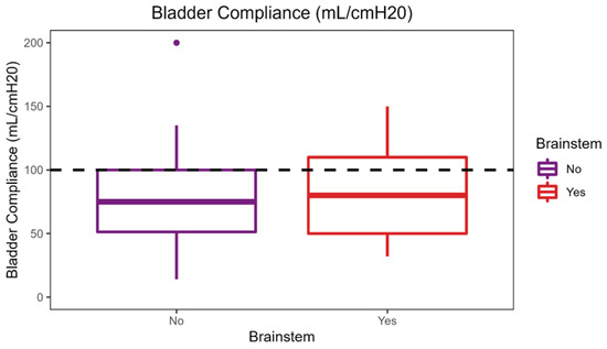 As shown in the figure, a median maximum cystometric bladder capacity of 387.5 mL was achieved in patients without a brainstem lesion, which is significantly higher than the median maximum cystometric bladder capacity of 325 mL in patients with a brainstem lesion. Patients with brainstem lesions had a higher median bladder compliance of 100 mL/cmH2O compared with patients without brainstem lesions with a median of 90 mL/cmH2O.