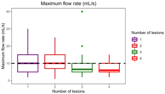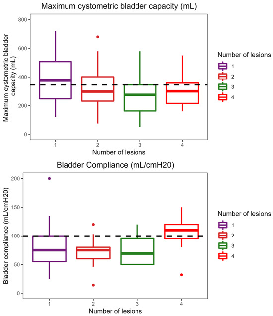 The median maximum cystometric bladder capacity obtained in the sample is 345 mL and is represented by the horizontal line in the plot. The figure provided illustrates a notable trend: the median maximum cystometric bladder capacity is highest among patients with a single lesion localization, measuring 400 mL, and gradually decreases as the number of lesions increases. The figure illustrates that patients with four different lesion localizations achieved the highest bladder compliance of 110 mL/cmH2O (compared to the sample median bladder compliance of 100 mL/cmH2O). As shown in the boxplot, patients with one and two different lesion localizations had the highest median flow rate (both 10 mL/s). The maximal flow rate of patients with three or four lesion localizations was significantly lower.