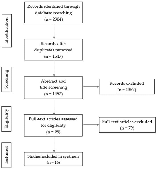 Initial searches of the scientific databases yielded 2904 results, with a total of 1547 studies once duplicates were removed. The titles and abstracts of the studies from the search results were assessed for eligibility and studies were excluded if they did not meet the review criteria (1452 studies). A total of 95 studies were reviewed in full-text and reasons for exclusion at this stage were recorded. Following eligibility checking, 16 studies were regarded as eligible for review. The PRISMA flowchart displaying the selection process of the reviewed studies is shown in Figure 1.
