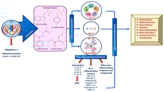 During CKD specifically, an increase in adipokines and adhesion proteins (e.g., intercellular and vascular cell adhesion protein 1 (ICAM-1 and VCAM-1, respectively) is observed, which triggers uremic toxins’ activity. Uremic toxins subsequently play a vital role in the both the onset and the evolvement of inflammation signaling pathways by activating and increasing c-reactive protein (CPR), NO and NF-κΒ. More specifically, growing evidence further supports the degenerating impact of uremic toxins including indoxyl sulfate, p-cresyl sulfate, hippuric acid, homocysteine, etc. on the progression of CKD-related health complications [69,70]. As a result, increased levels of pro-inflammatory cytokines such as interleukins 1β and 6 (IL-1β and IL-6) that suppress PTH secretion, tumor necrosis factor α (TNF-α) and other pro-inflammatory enzymes and molecules are exhibited. Consequently, the inflammatory state is amplified and complications like malnutrition, atherosclerosis, heart failure, mineral and bone disorders, coronary artery calcification, anemia, etc., are aggravated (Figure 2) [47,58,60].